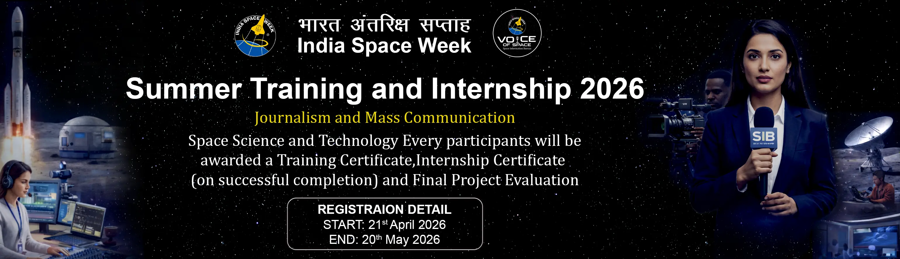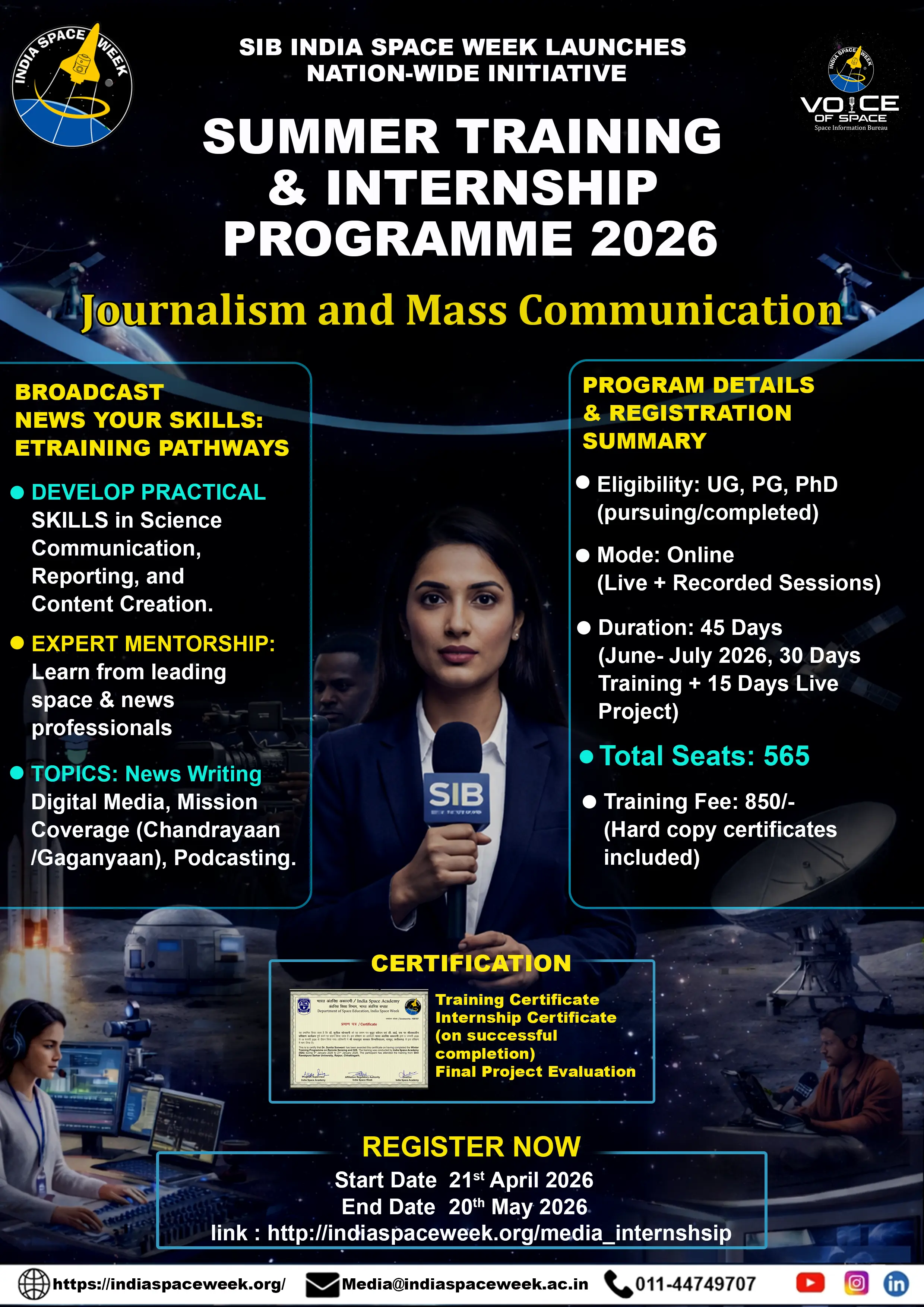 The Summer Training and Internship Programme 2026 on Journalism & Mass Communication in Space Science and Technology is an innovative initiative dedicated to developing skilled science communicators and media professionals. The programme focuses on bridging the gap between scientific advancements and public understanding by offering hands-on training in science communication, digital media, reporting, and content creation. With a special emphasis on space science and emerging technologies, we aim to empower students from diverse academic backgrounds to create clear, engaging, and impactful scientific narratives while promoting scientific awareness and responsible media practices in India.