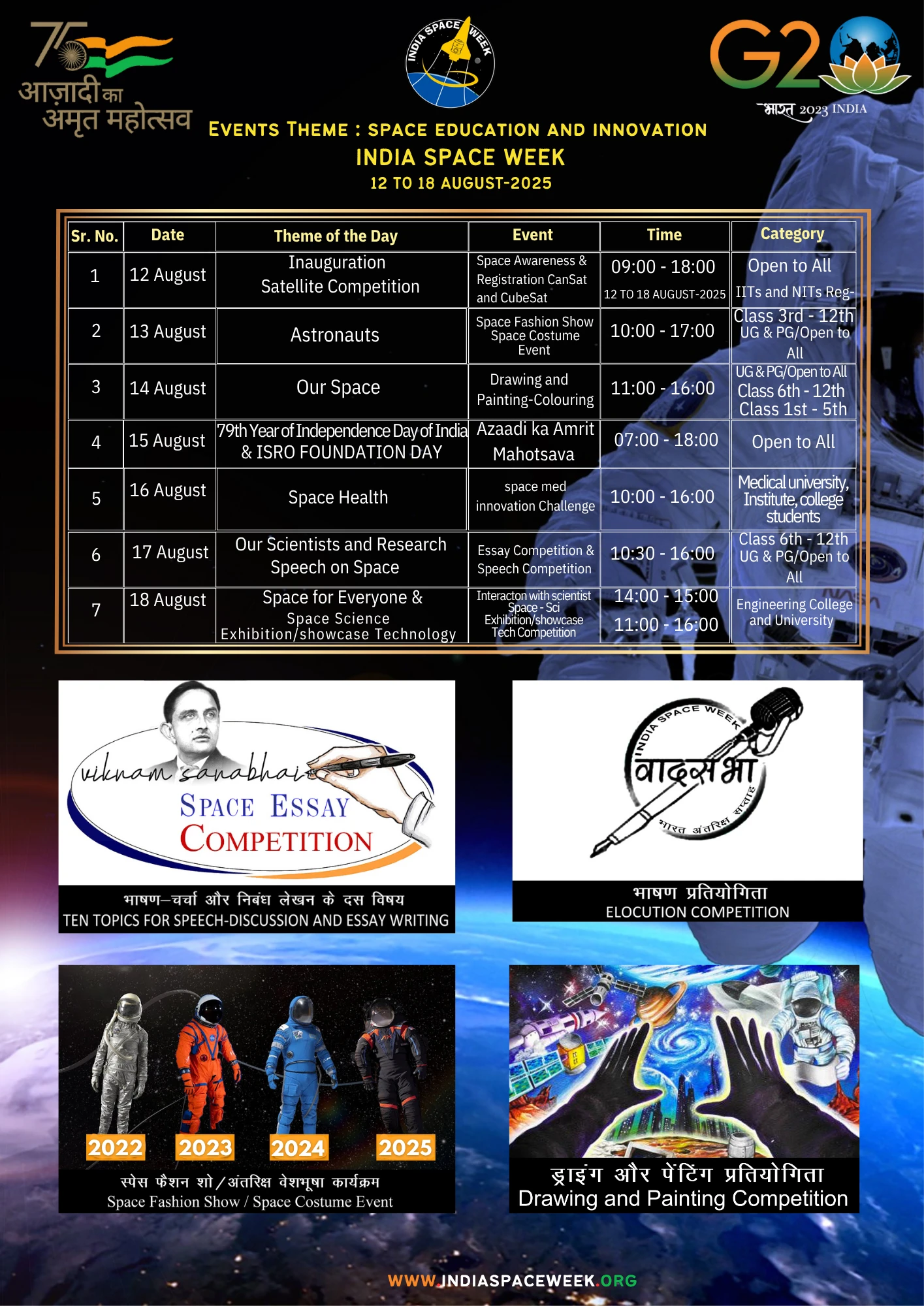 India Space Week consists of space education and outreach events held by space agencies, aerospace companies, schools, College, University, planetaria, museums, and astronomy clubs around the National in a common timeframe. India Space Week is coordinated by the India Nation with the support of the India Space Week Association (ISWA). The ISWA leads a global team of National Coordinators, who promote the celebration of India Space Week within their own countries. The ISA AND IICT declared in 2022 that India Space Week will be held each year on the Celebration of birth of 12-18 august Vikram Sarabhai.